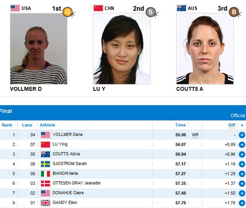 Bơi bướm 100m nữ có kỷ lục mới. Vận động viên người Mỹ, Dana Vollmer lập kỷ lục mới ở cự ly bơi bướm 100m. Với thành tích 55giây 98, Vollmer đã vượt qua cô gái người Trung Quốc, LU Ying, để giành tấm HCV ở cự ly bơi bướm 100m. Xếp thứ 3 là COUTTS Alicia của Úc. Trước đó kỷ lục ở cự ly này thuộc về Sarah Sjöström (Thụy Điển) vào năm 2009 với thành tích 56 giây 06.